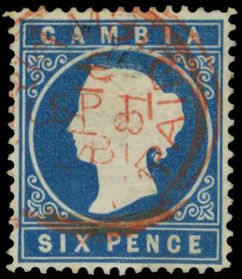 1881 6d blue double strike of Gambia/Paid cds 'SP 11 81' in red fine used. SG 18A £110