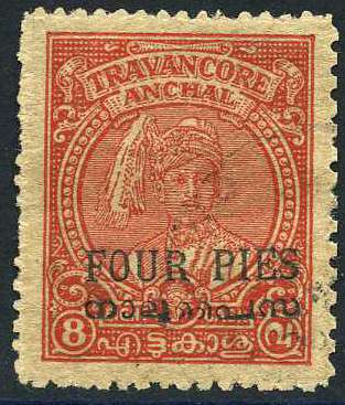 1949 4p on 8ca carmine, perf compound 12½ x 11, lightly used; minor bend, some clipped perfs, still difficult. SG 4f, £70