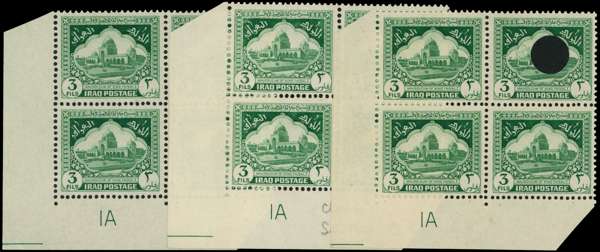 1943 3f emerald, three plat '1A' blocks of 4, one with R 9/2 'cloud flaw', one with flaw officially erased by hand and one with 9mm punch hole leaving flaw fully in tact. A most interesting group. Unmounted o.g. SG 210,a,b £104