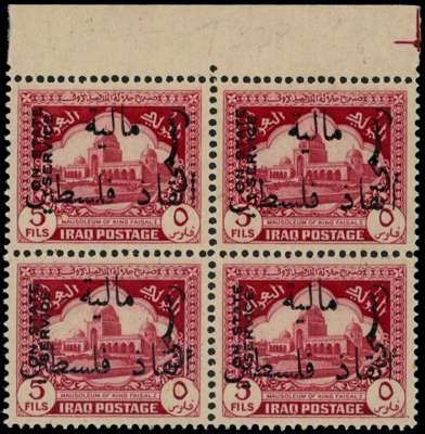 1949 5f lake, perf 14, obligatory tax, top marginal block of 4 unmounted o.g. SG T328b