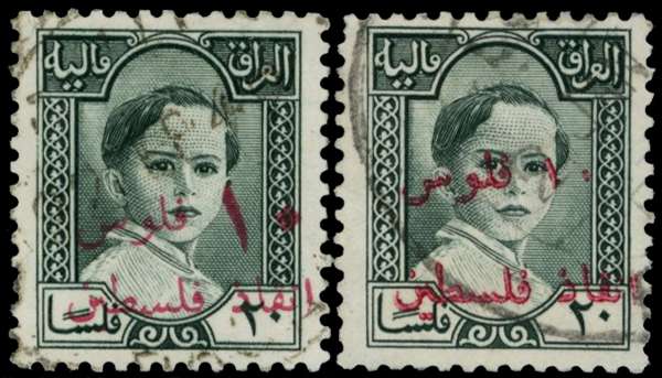 1949 10f on 20f slate-green and another showing small Arabic '10' ('1' 1¾mm) fine used SG T336, T336a £195