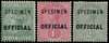1890-91 ½d green, 1d rose and 2d grey set of 3 overprinted 'SPECIMEN' (type D12) fine o.g. SG O3s/O5s £140