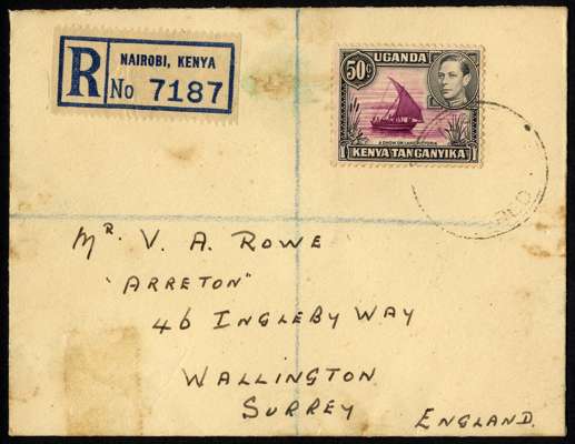 1938 50ct perf 13 x 11¾ on registered cover to UK, tied by light Nairobi CDS, the stamp with R2/5 rope not joined to sail. Some gum permeation at the perfs, and the envelope stained in places which just affects the stamp, but scarce on cover. SG 144a, cat £250 off cover
