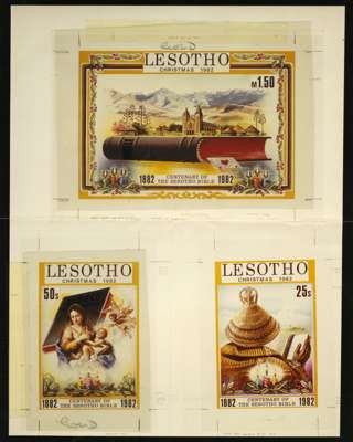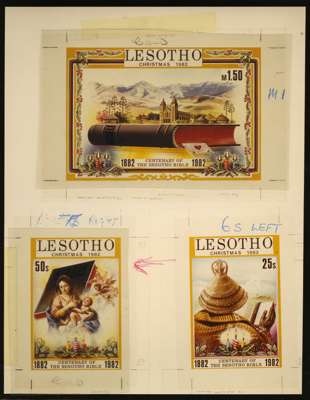 1982 Centenary of the Sesotho Bible, photographic artwork in colour for the three values on a single sheet, two of each, four with plastic overlays. Originally intended for Christmas 1982 issue. One sheet with DIRECTOR OF POSTAL SERVICES/ MASERU handstamp on reverse, with notes, signed 'Approved'. Also unissued 1.50m Louis Braille, artist's original coloured design for 1981 International Disabled Year, with annotations and plastic overlay, slight staining at left well clear of design from sellotape