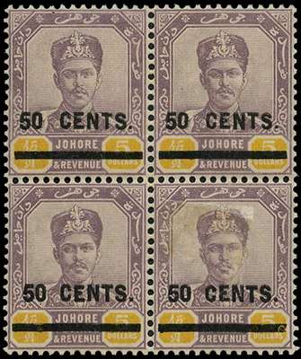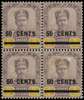 1904 50c. on $5 dull purple and yellow (surcharge type 32), block of four, full original gum, lower right stamp previously mounted on surface. Otherwise fine, a desirable multiple. SG 60 cat £320