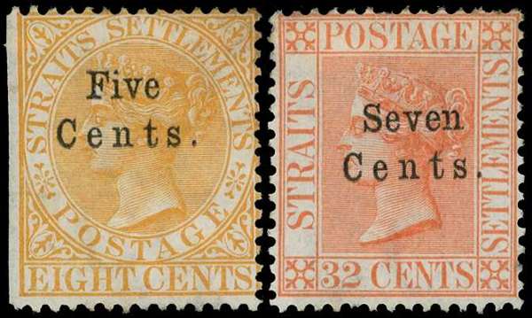 1879 5ct on 8ct and 7ct on 32ct. Fresh-looking unused examples, regummed, the 5ct with cut-down wing margin at left. SG 20-1, £350