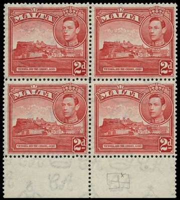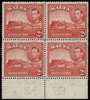 1943 2d scarlet lower marginal block of four, top right stamp with R5/8 'flag on citadel'. SG 221bb, £130