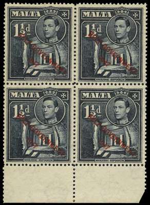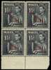 1948 Self-Government 1½d blue-black lower marginal block of four, upper left stamp with R5/7 broken cross. SG 237aa, £170