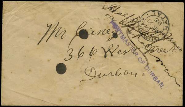 1895 COLEMAN PROVISIONAL: envelope addressed locally with manuscript "half penny received/in money" and postmasters’ signature, Durban (21 Mar) double-ring ds overlapping, violet ‘POSTMASTER OF DURBAN’ hs alongside. In March 1895 there was a shortage of ½d stamps that led to provisional overprinting of ½d on 6d stamps. Between the 18th and 23rd March (excluding Sunday the 19th) J,W. Coleman wrote and signed envelopes in lieu of ½d stamps. A scarce cover with this provisional cachet
