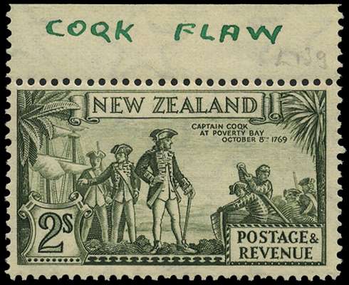 1936-42 2/- olive-green perf 14 x 13½ top marginal with R1/4 COQK variety, o.g., hinged on selvedge only (ink inscription on selvedge). SG 589ea, £190