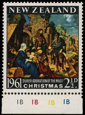 1961 2½d Christmas with watermark sideways inverted, bottom marginal with plate numbers, unmounted mint with faint bend. SG 809w, £80