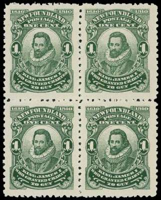 1910 1ct green unmounted o.g. block of four, showing the R5/1-2 RP varieties NFWFOUNDLAND and JAMRS. Unusually fine for this. SG 95, a, b, £208