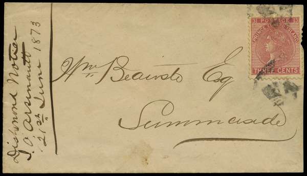 1873 cover from Charlottetown to Summerside franked by 3ct rose, perf 11½x12, tied by two strikes from 'triangle' cork type (P128) cancel; backstamped by Charlottetown d/s for JU 21 and Summerside arrival for JUN 23, part of left flap missing( causing a ting perf nick), still an attractive late usage as Prince Edward Islands joined the Confederation just a week later and its stamps became obsolete. SG 37