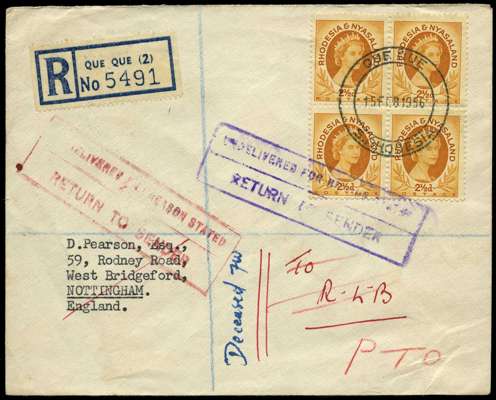 1956 (15 Feb) plain registered FDC to Nottingham from sender at Nakuru with block of four 2½d ochre, Que Que CDS. 'Deceased' in ink on front, ' 'To R.L.B.' and boxed 'UNDELIVERED FOR REASON STATED' cachets, in red and violet on front. Reverse with five different CDSs; Que Que despatch, Nottingham R.L. Duty, RLB Salisbury, Bulawayo and Nairobi; manuscript account on envelope of opening at Salisbury RLO, and type-written account of the envelope's journey from the sender. Different! SG 3a