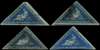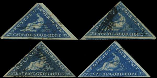 1853 4d blue and deep blue on slightly-blued paper, four examples, each with three clear to large margins. Selected for shades, ranging from dark to very bright blue, the latter close but just clear at base, lightly cancelled thus showing the shade to maximum effect. SG 4, a