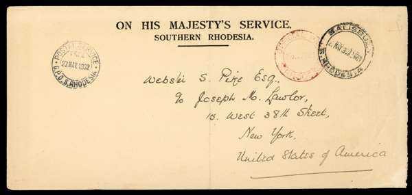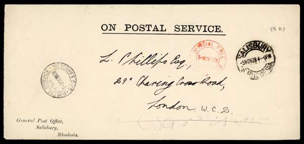 POSTAL HISTORY: 1928-32 Stampless Official covers both with "POSTAL SERVICE / FREE / G.P.O S. RHODESIA" c.d.s and differing Salisbury datestamps, the first with "ON POSTAL SERVICE" heading and G.P.O Salisbury imprint at left handstamped red "OFFICIAL FREE / SALISBURY S.R" cds ( Proud OPD5, later than recorded), the second with "ON HIS MAJESTY'S SERVICE / SOUTHERN RHODESIA" heading and red "OFFICIAL PAID / S. RHODESIA" cds (Proud OPD7, earlier than recorded), fine and scarce.