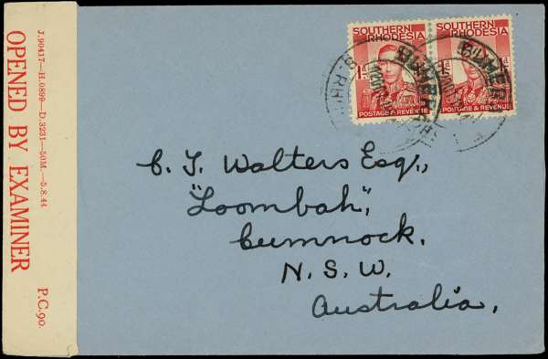 POSTAL HISTORY: 1944 Censored cover to Australia franked by 1937 1d scarlet pair, tied by Buhera S. Rhodesia cds for 12 07 1944, (Proud Type D3), fine, an uncommon datestamp. SG 41