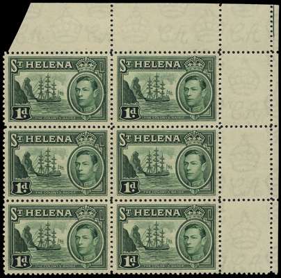 1938 1d green upper right corner block of six, lightly hinged on selvedge only, the stamps unmounted o.g. SG 132, £84