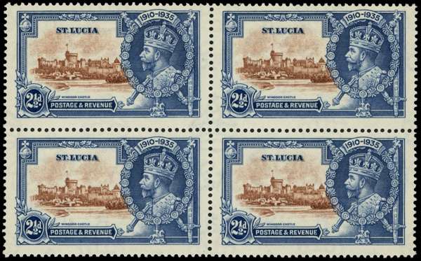 1935 2½d brown and deep blue Silver Jubilee, block of 4 l/r showing Plate 2B: R 8/3 'dot to left of chapel' variety fine unmounted o.g. SG 111g £180
