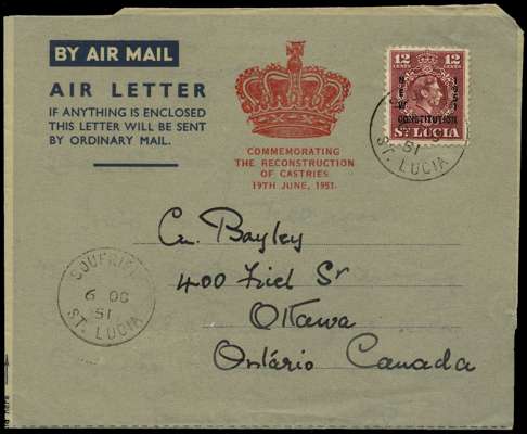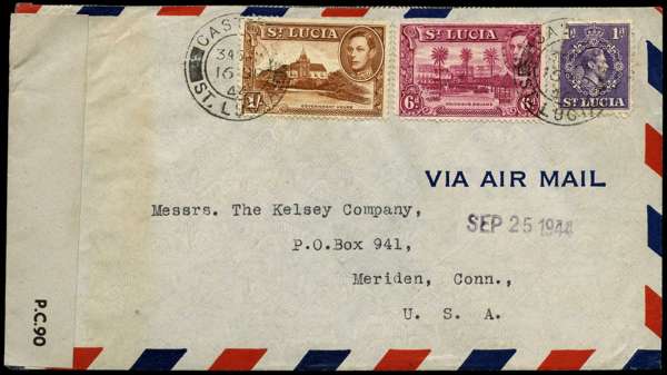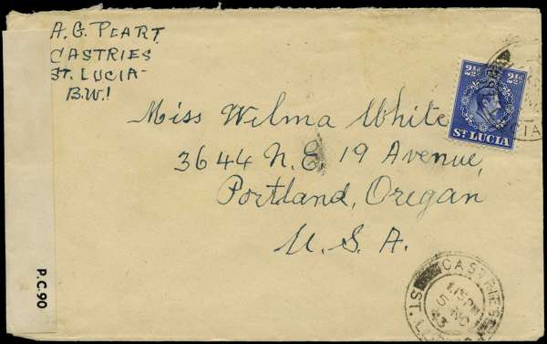 CENSORED MAIL: Two envelopes addressed to the USA, comprising 1943 (5 Nov) franked with 1938-48 2½d and 1944 (16 Sept) franked with 1938-43 1d (defective), 6d, 1s; both tied by Castries double-ring ds and sealed with 'P.C.90/OPENED BY EXAMINER' white tape. Also 1951 Reconstruction of Castries Air Letter to Canada cancelled with Soufriere cds. Fine