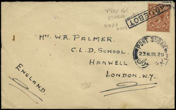 1929 Cover addressed to London bearing GB 1½d tied by 'boxed PAQUEBOT' alongside "Port Sudan 23 MAR 29" cds, the reverse with "Shellal-Halfa 30 MR 29 T.P.O. N1" cds, an interesting cover