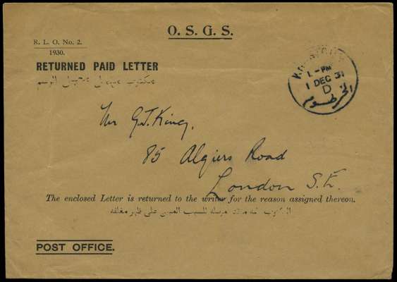 1931 stampless O.S.G.S. envelope 'RETURNED PAID LETTER' (R.L.O. No 2/1930) addressed to London cancelled by "KHARTOUM 1 DEC 31" cds, a scarce usage