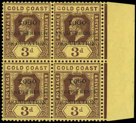 1915 13d purple on yellow r/h marginal block of 4, l/r stamp showing thin 'G' in 'TOGO' (position 24) fine unmounted o.g. SG H38b £140