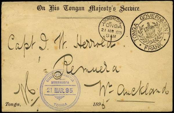 1895 O.H.T.M.S. envelope (147 x 95mm) addressed to Capt. Herrold in Remuera NZ, tied by clear strike of 'Tonga Government Frank and 'Nukualofa 21 MR 95' ds, alongside a clear strike of the Chief Postmaster William Campbell personal date stamp, believed to be the best of the only 5 recorded, the reverse with 'Auckland 10 AP' arrival cds, few usual imperfections otherwise a rare and attractive envelope Ex Peach, Ex Baxendale