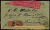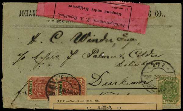 BOER WAR: 1899 (24 Oct) envelope franked with 1896-97 ½d (defective) and 1d, pair, cancelled with 'Johannesburg, Z.A.R' ds, black on pink 'Boer Geopend onder Krijgswet' label (removed and replaced) and British provisional black on white 'V Arms R/OFFICIALLY SEALED IN THE/Post Office at ...P.L.O.... Natal', the reverse with 'G.P.O./E/7 NO/99/NATAL' double-ring ds. Scarce. SG 216/7