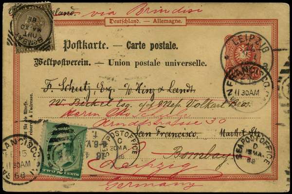 POSTAL HISTORY - AROUND THE WORLD: 1888 German 10pf carmine postal stationery card cancelled 'LEIPZIG /9/1/88' addressed to San Francisco, USA then forwarded to India franked by 2c green tied by 'SAN FRANCISCO /FE 15/11 30 AM/88' duplex and then returned to Germany and additionally franked by 1a sepia tied by 'BOMBAY /OUT/MA. 30/99 squared circle; the card also postmarked with two 'SEA POST OFFICE /D/15 MA./88 cds and unclear German arrival. A most interesting item