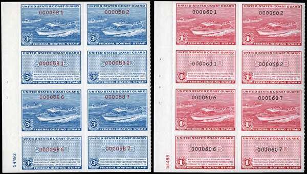 Revenues: 1960 Federal Boating Stamps, $1 rose-red and $3 blue (Scott RVB1/2) in plate number blocks of 4, fresh u/m, cat $350