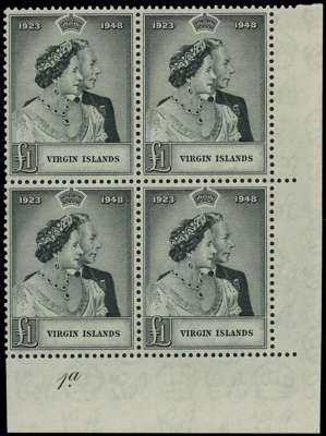 1949 £1 Silver Wedding lower right corner block of four with Plate 1a, lightly hinged on the selvedge leaving the stamps unmounted o.g. SG 125, £64