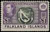 Falkland Islands £1 in black and reddish violet 1938 printing, unmounted o.g. SG 163, Heijtz 93b