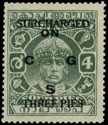 Officials. 1943 SURCHARGED/THREE PIES on 4p green, fine large part o.g., difficult stamp. SG O63, £400