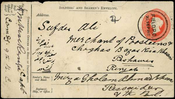 POSTAL HISTORY: Sudan 1885 9pi orange 'Soldiers and Seaman's envelope' to Punjab cancelled by Field P.O. for 25 Sep 85, sent by a soldier from the Indian Contingent during the Second Swakin Expedition 1885-86, countersigned by Commanding Officer, various backstamps, roughly opened still very rare.