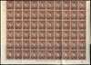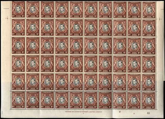 1942-9 1ct perf 13¼ x 13¾ Plate 2-2-4A sheet of 100, R2/6 with complete omission of 'A' of 'CA' in watermark. Also R9/6 retouched value tablet, 2/5 broken breast (early state), unmounted o.g. with several folds. SG 131a, ab, ad, £270