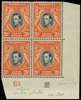 1951 20ct black and deep orange Plate 10A-8B block of four, hinged on top pair only, patch of missing gum on selvedge. ...