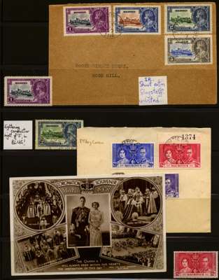 1937 Coronation issue. A truly in-depth study, principally of the multitudinous scratches affecting the 20ct, but also with some varieties on the 12ct. Many positional pieces of the 20ct with a top left block of fifteen, unmounted o.g., with the R2/2 and 5/3 varieties; additional R2/2 mint and used, and 5/3 mint and two used. Also a small group of cancels, and a Silver Jubilee set on philatelic cover. An extraordinary collection