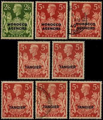 British Currency 1949 2/6d o.g. with ink smudge on lion's tail, 5/- o.g. with part guideline in 'T', and another 5/- used (Tetuan CDS) with inverted 'T' guide in hair and re-entered lion. SG 92-3. Tangier 1949 5/- three o.g. examples with the scarce R1/1 'T' guide on the jawline and a used example with the very scarce double 'T' on jawline, SG 274