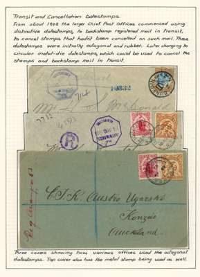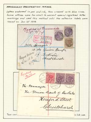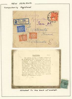 POSTAL HISTORY: 1886-1942 selection of covers written up and mounted on pages we note: two registered covers to Christchurch bearing manuscript registration marks, a method used by smaller post offices (whom did not possess a dedicated handstamp) prior to the introduction of registration labels, three covers showing octagonal datestamps to backstamp registered mail, postal stationary envelopes and 1942 cover bearing 1939-49 Compulsorily Registered envelope, and taxed 8d byPostage Dues 2d and 3d (2) with label affixed to reverse. Fair to fine condition, and interesting lot.