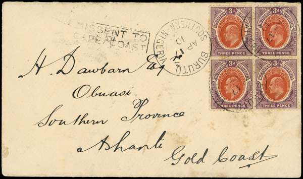 POSTAL HISTORY: 1910 cover to Gold Coast, franked by 3d orange-brown and bright purple, block of four, neatly tied by Burutu Southern Nigeria cds for AP 17, with MISSENT TO CAPE COAST boxed h/s at left, backstamped by Forcados, Cape Coast, Sekondi, and Obuasi markings; attractive cover with many interesting marks. SG 25