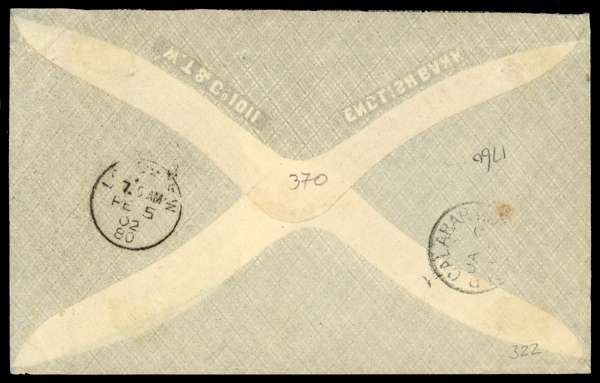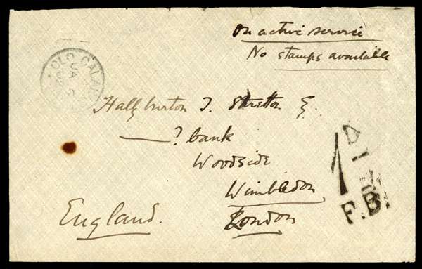 POSTAL HISTORY: 1902 Officer's letter from Old Calabar to Wimbledon, mounted on loose album leaf, endorsed 'On active service/ No stamps available' at upper right, sent while part of the Aro Expedition, 'Old Calabar River' cds for JA 6, at left, taxed '1d./ F.B.' in black on arrival in England at lower right, backstamped with Old Calabar cds and London arrival for FE 5, fine and scarce.