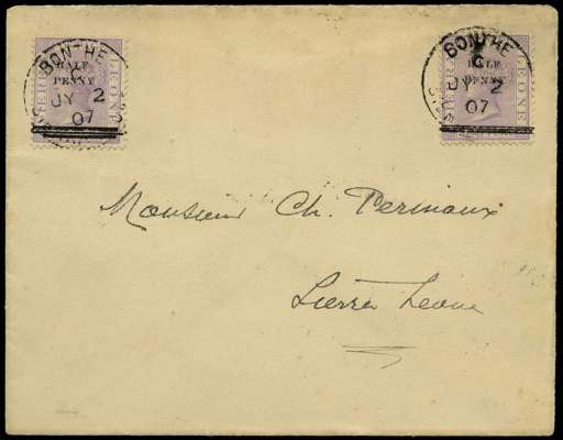 1907 Internally addressed cover bearing ½d. on 1½d. pale-violet surcharges type 3 (2) with one showing "HALF PFNNY" variety, each tied by 'BONTE SIERRA LEONE' cds dated JY 2 07. Cover opened on two sides at top and at right. A scarce stamp on cover. SG 39,39b