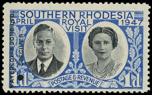 1947 1d Royal Visit in unissued colours of black and blue, punched and overprinted WATERLOW & SONS LTD/ SPECIMEN, unmounted...