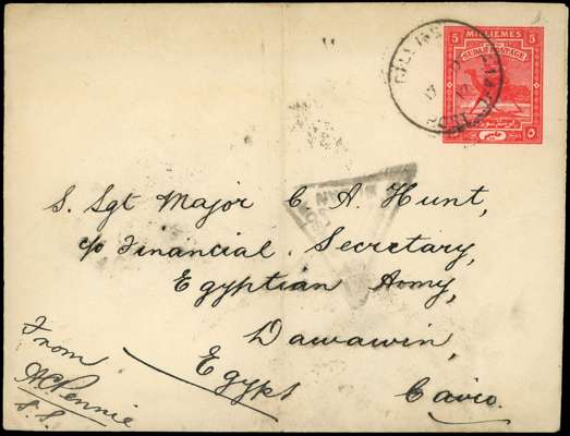 POSTAL HISTORY: 1917 5m red Postal Stationery envelope to Cairo, cancelled by Dilling cds for 17 DE, with triangular Censor Mark number illegible, with only a few examples with legible numbers, backstamped by various transit marks, very scarce. Plus 1929 10 mils stationery envelope addressed to London cancelled by "Mongalla 14 IV 929" cds, the reverse with "KHARTOUM" 21 AP 29" transit cds(2)