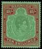 1943 10/- yellowish green and deep carmine-red on green, showing variety BROKEN LOWER RIGHT SCROLL, full unmounted o.g; very fine example. SG 119ce