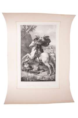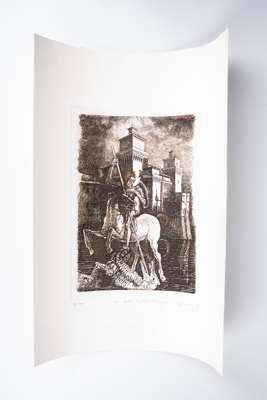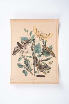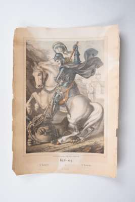 A collection of artworks including; Emil Hochdanz chromolithographed engraving of various different species of moth (1816 - 1885); two prints from Sir W. Jardine's 'The Naturalist’s Library, Entomology, Foreign Butterflies' (1837); original late-20th-century etching of 'le lotte contro il drago' (the fight against the dragon), print 15 of 100; decorative chromolithograph of St. George slaying the Dragon, published by J.G May Sohne in Frankfurt (1850-1880); Der Heilige Georg, after Raphael, German steel engraving circa 1830-1850 engraved by a German master engraver and published in Central Europe.