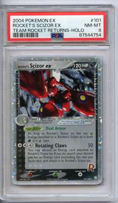 This Rocket's Scizor ex Holo #101 from Team Rocket Returns has been graded and authenticated by PSA, achieving a grade of 8 (NM-MT).