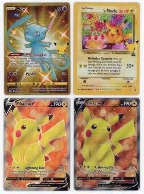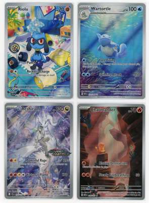 Wartortle #171 Illustration Rare (151), Charmander #168 Illustration Rare (151), N's Reshiram #167 Promo Stamped Illustration Rare (Journey Together), Riolu #215 Illustration Rare (S&V Base), Pikachu V #157 (Brilliant Stars), Pikachu V #157 (Brilliant Stars), Mew #25 Secret Rare (Celebrations), and Birthday Pikachu #24 (Celebrations).
