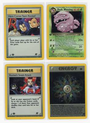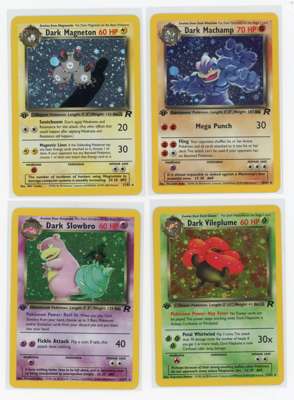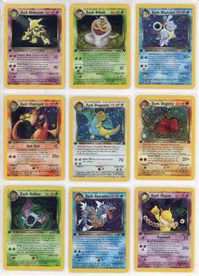 Dark Alakazam Near Mint or better, Dark Arbok Light Play (vert minor binder ding), Dark Blastoise Light Play, Dark Charizard Near Mint or better, Dark Dragonite Near Mint or better, Dark Dugtrio Near Mint, Dark Golbat Near Mint or better, Dark Gyarados Near Mint, Dark Hypno Near Mint or better, Dark Machamp Near Mint, Dark Magneton Near Mint or better, Dark Slowbro Near Mint or better, Dark Vileplume Near Mint, Dark Weezing Near Mint, Here Comes Team Rocket Near Mint or better, Rockets Sneak Attack Light Play, Rainbow energy Near Mint or better, the Dark Raichu is in Near Mint condition. Every other card in the collection is in light play to near mint condition or better but the vast majority are all Near Mint.